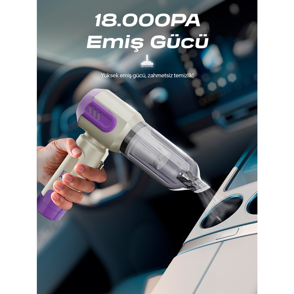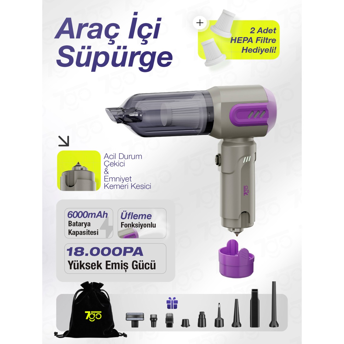 7go Ahv-14 2’si 1 Arada Kablosuz Araç Içi Süpürge Mor | 18000PA Güçlü Vakum + Üfleme | Cam Kırıcı & Kemer Kesici Acil Durum Özellikli