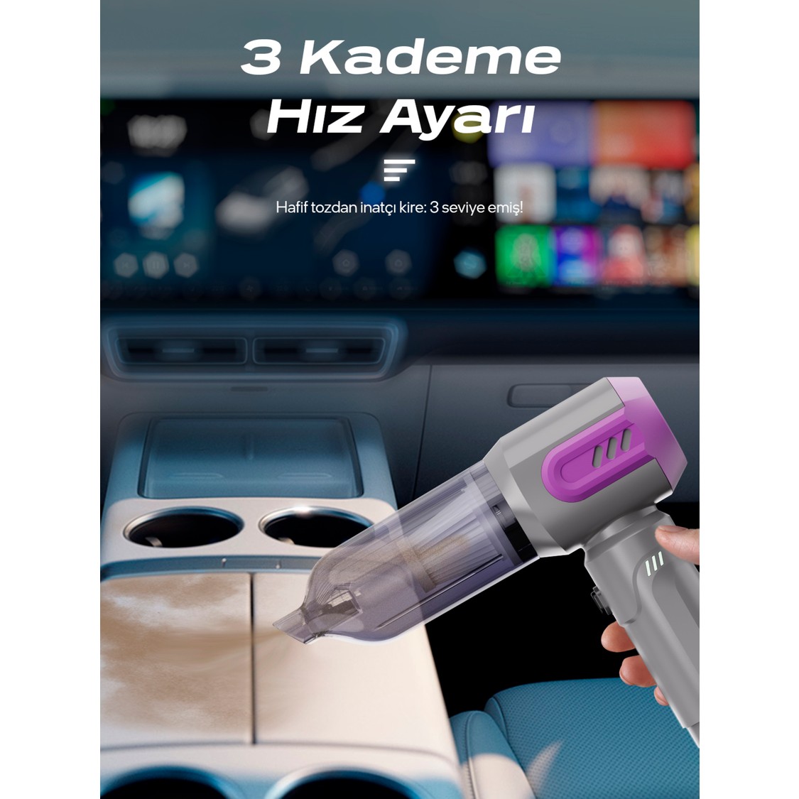 7GO AHV-14 Brushless 2in1 Araç İçi Süpürge ile aracınızı saniyeler içinde tertemiz yapın. 18000PA’ya kadar güçlü vakum gücüyle toz, kırıntı, saç ve inatçı kirleri kolayca temizler. Aynı zamanda toz üfleme fonksiyonu ile ulaşılması zor bölgelerde bile hijyen sağlar.