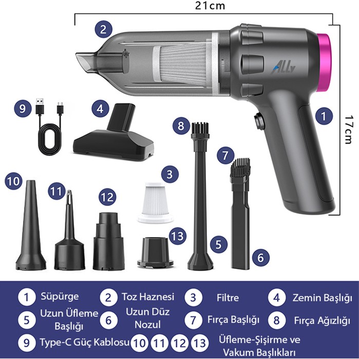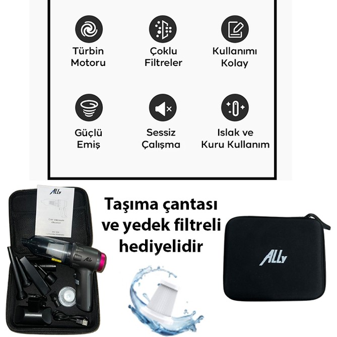ALLY 13600pa Güçlü Portatif 2 Kademeli Tasinabilir Vakumlu Kablosuz Üflemeli Mini Araç Süpürgesi
