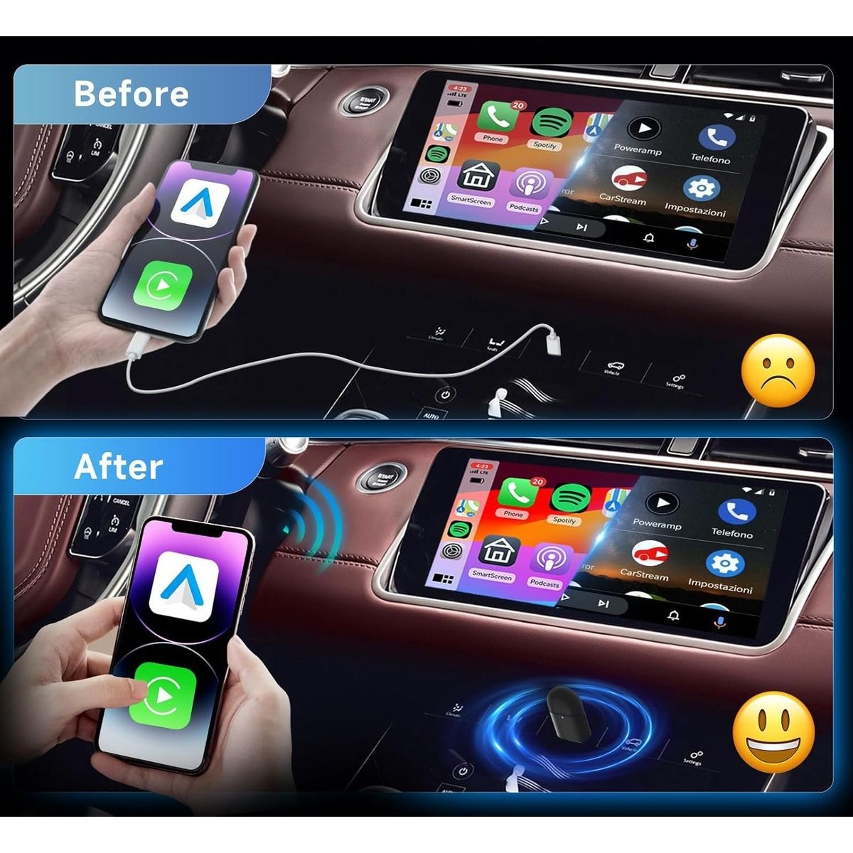 - ►【Arabada tam CarPlay/Android araç işlevselliği】Bu kablosuz CarPlay adaptörü/kablosuz Android araç adaptörü ile navigasyon, müzik çalma, Siri asistanı, çağrı ve daha fazlası gibi tüm CarPlay/Android araç fonksiyonlarını kullanmaya devam edebilirsiniz. Ekran dokunuşu, ses kontrolü, tuş kontrolü vb. gibi orijinal işletim sistemini korur.