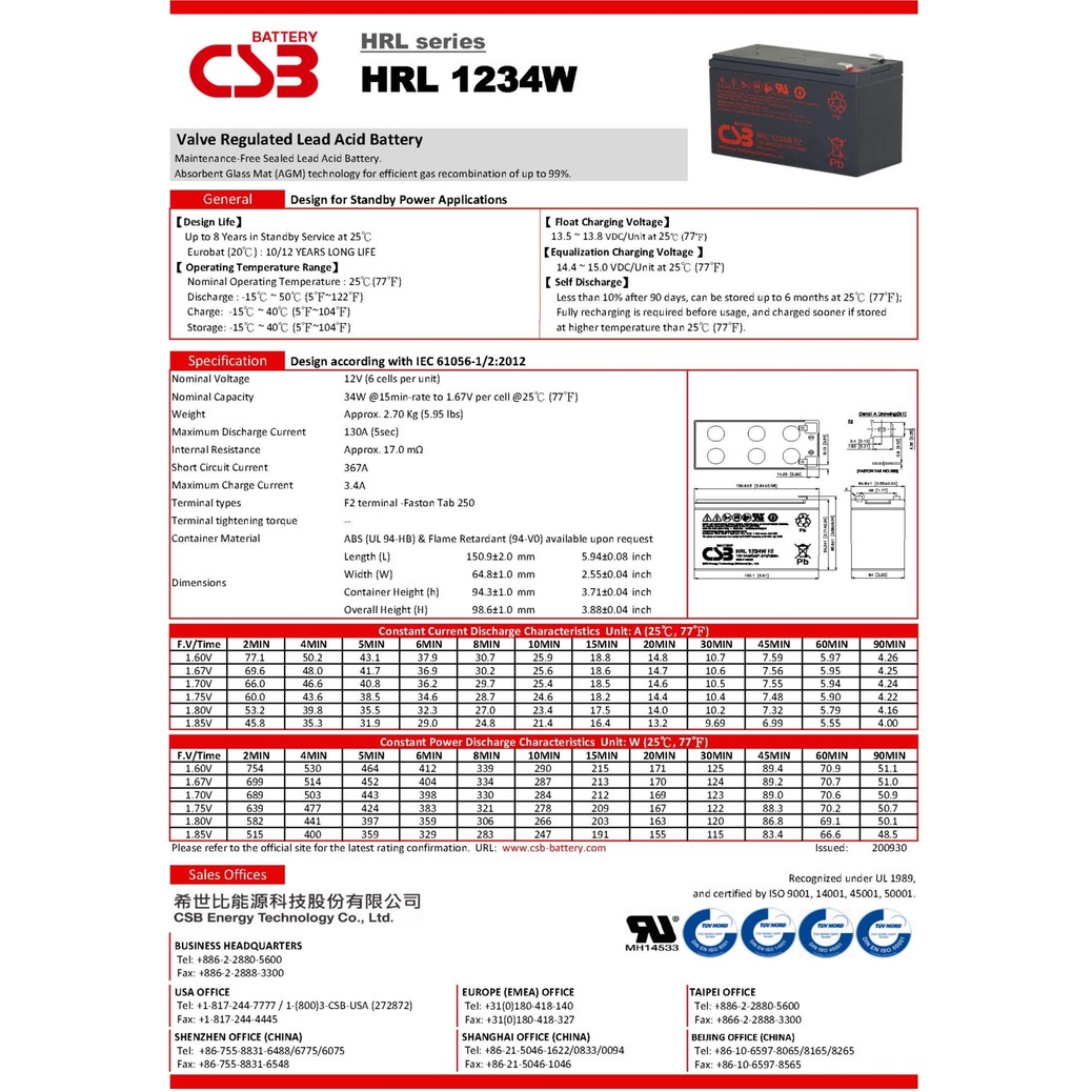 Csb HRL1234WF2 12VOLT 9AH Uzun Ömür Beklentili Bakımsız Kuru Tip Akü