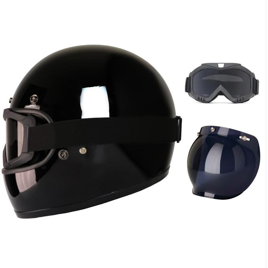 Ebakbak Motosiklet Retro Kask Harley Cafe Racer Vespa Modüler ve Anti Uv Cross Gözlüklü Motor Kaskı Siyah