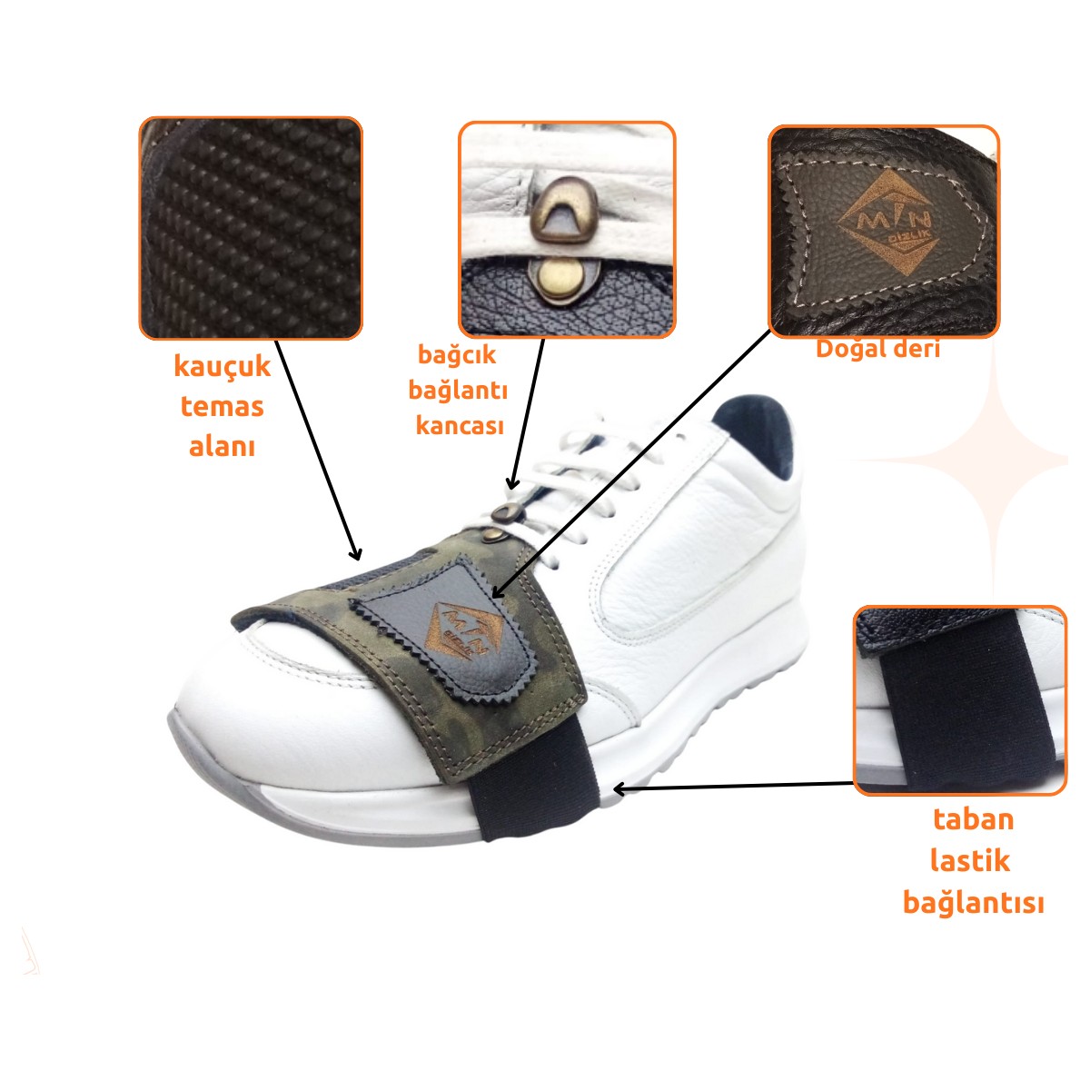 Ayakkabınızı , Motosiklet vites pedalının deforme edici temasından korurken , doğal derinin soft yapısı ile konforu ,modern ve klasik tasarımlar ,doğal derinin sunmuş olduğu geniş renk yelpazesi tarzınızı yansıtırken , fiyat /performas ürünü olarak sunduğumuz MTN Mak serisi Ayakkabı koruma pedleri ile Ayakkabılarınız yepssss yeni kalacak