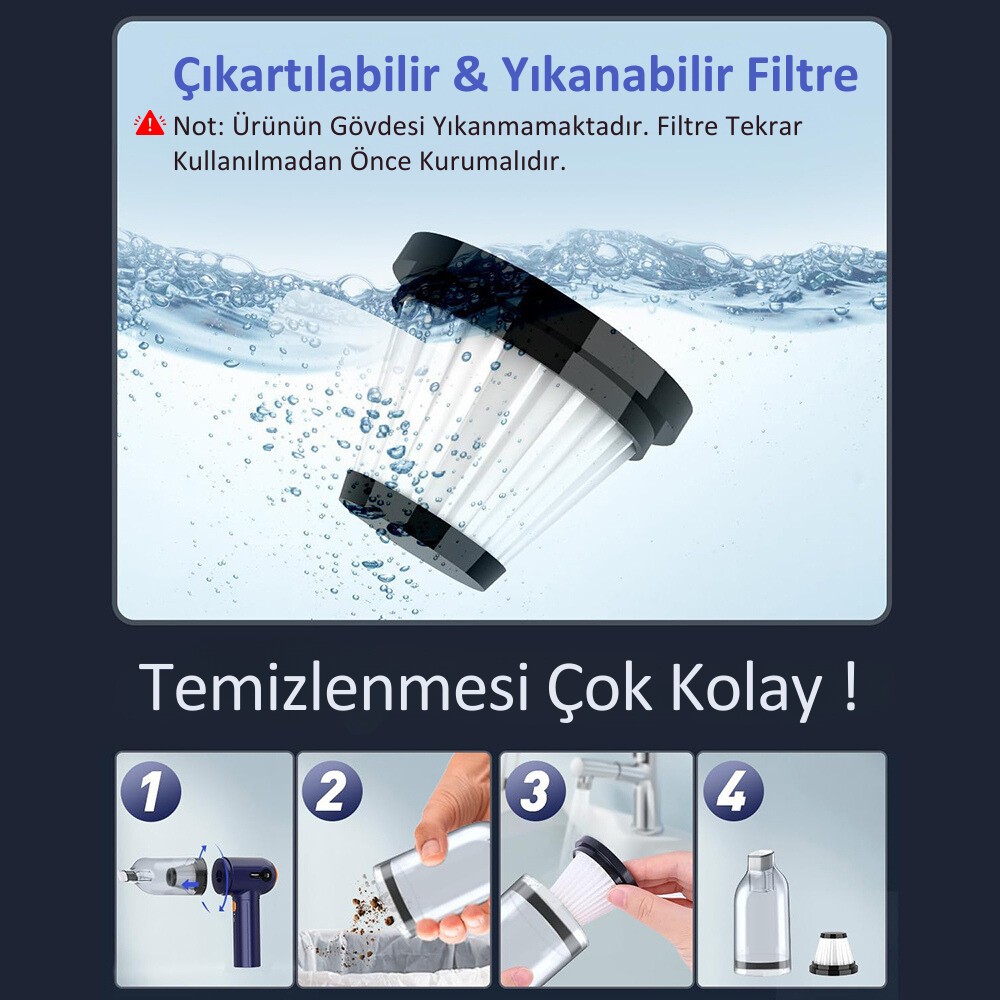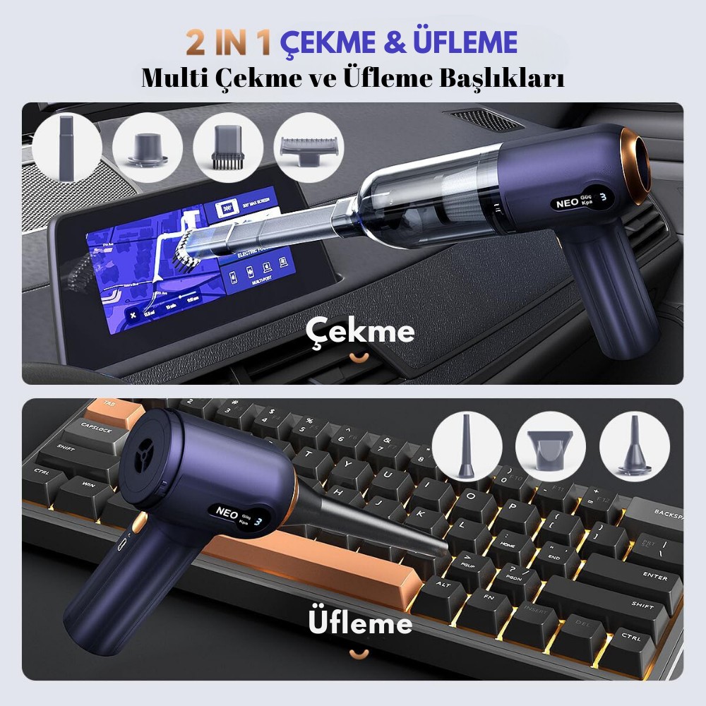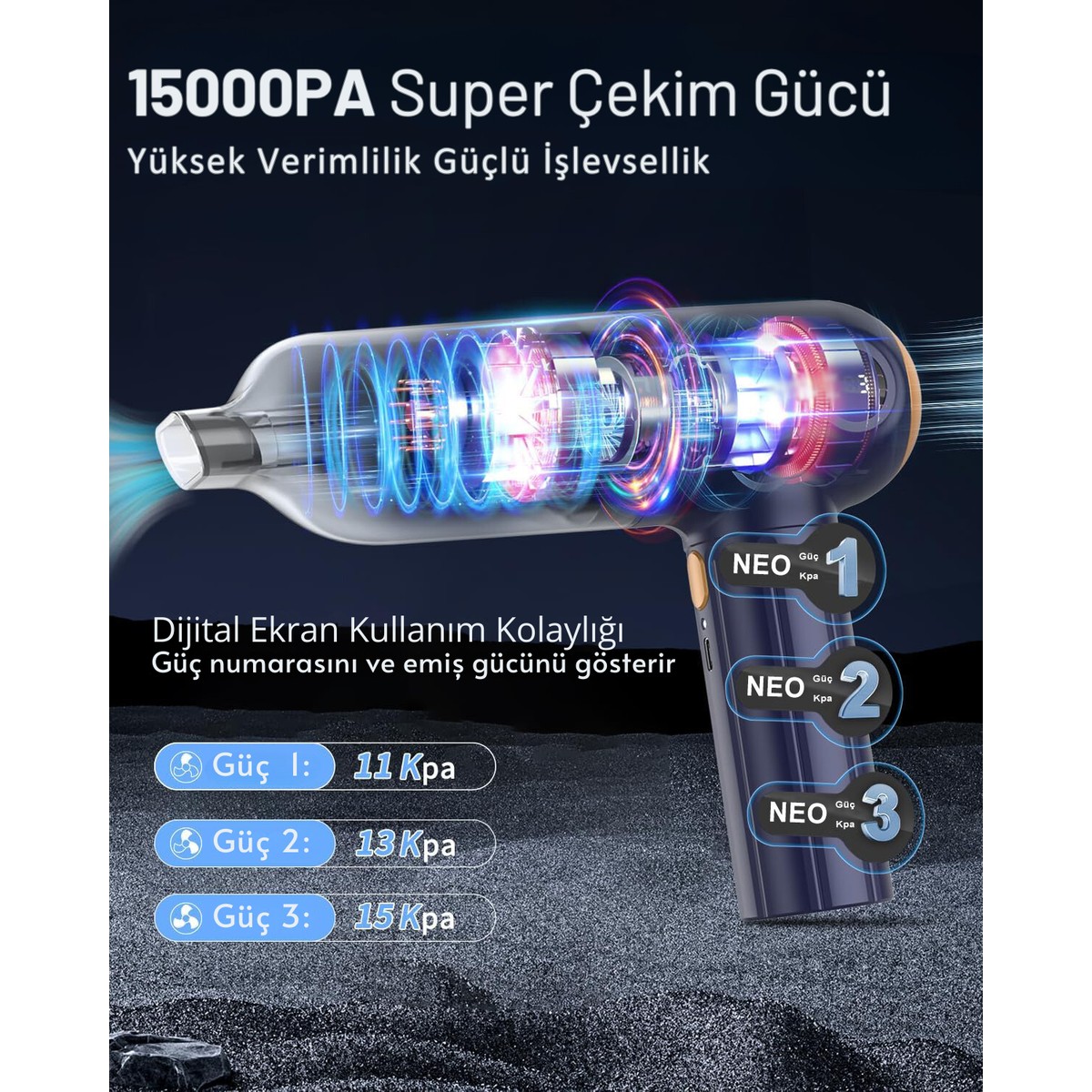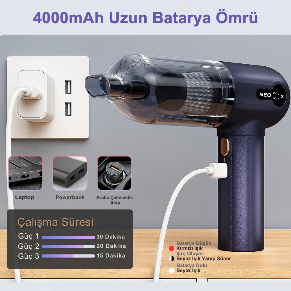 Neo 3 Kademeli Süper Şarjlı Araç Süpürgesi Ev-Ofis-Araba Kullanımı Çok Fonksiyonlu Emiş Gücü 15000pa