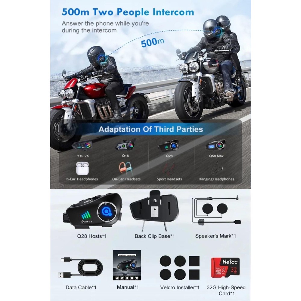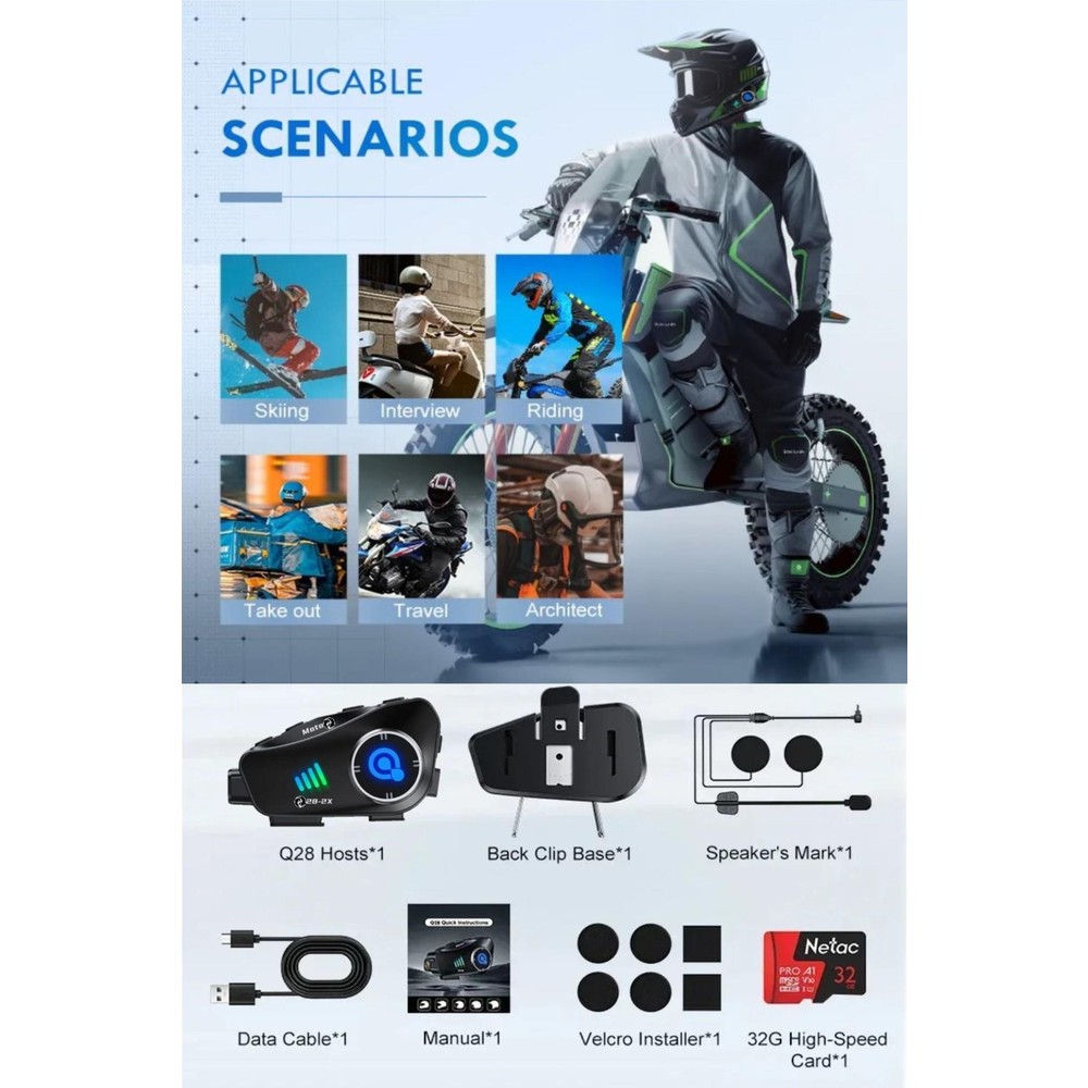 • Q-28-P 2 Eşleşmeli intercom, motosiklet sürücüleri için pratik ve kullanışlı bir iletişim çözümü sunar. Su geçirmez tasarımı, uzun çekim mesafesi, Bluetooth 5.3 teknolojisi ve uzun ömürlü bataryası ile dikkat çeker.