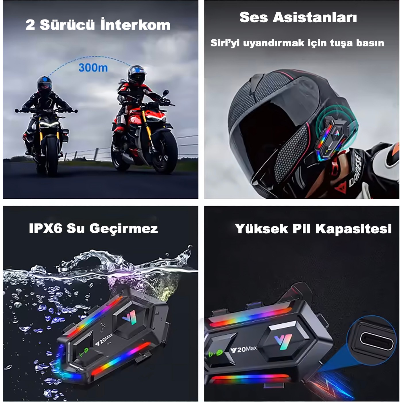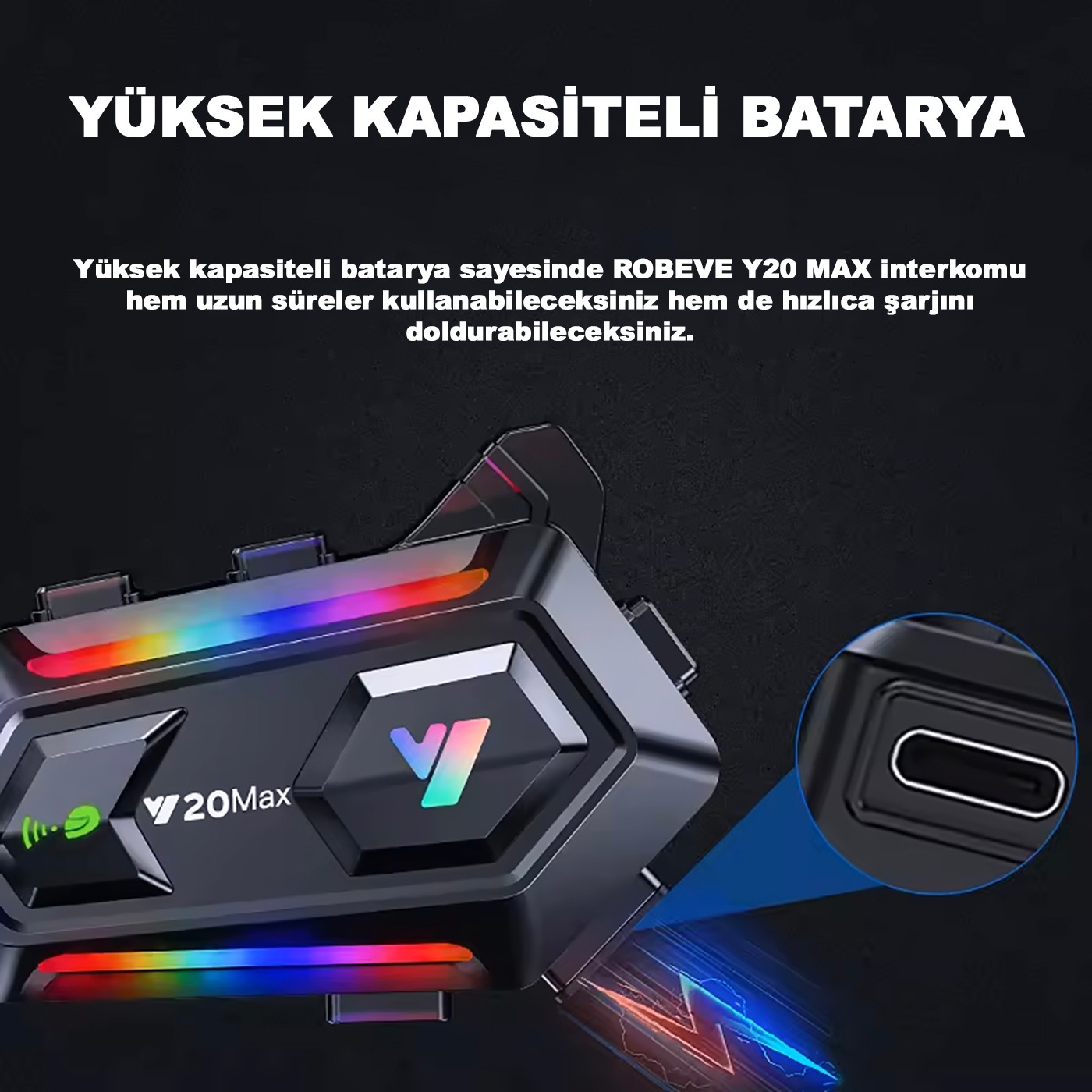 Robeve Ikili Interkom Bağlantılı Y20 Max Motorsiklet Intercom Su Geçirmez Kask Intercom Rgb Intercom Bluetooth 5.3 Interkom Ikili Interkom Bağlantılı Intercom