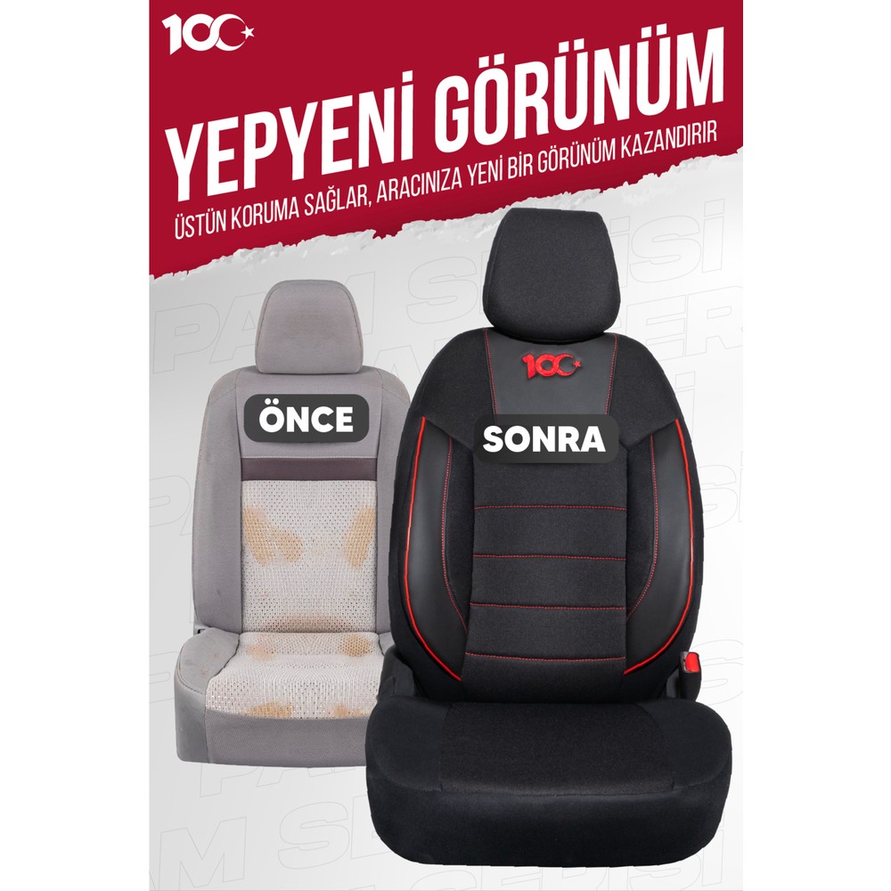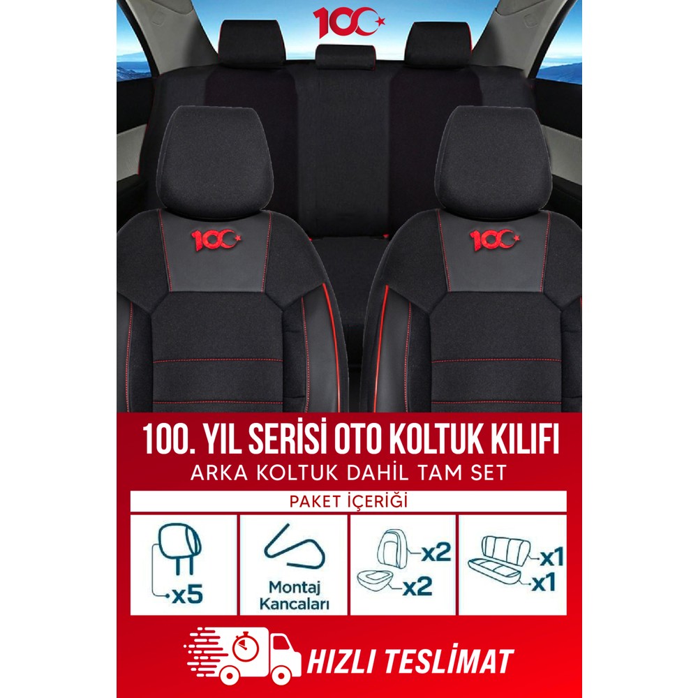 100. Yıl Özel Serisi Oto Koltuk Kılıfı, arka koltuk üçlü tek parça oturma ve üçlü tek parça yaslanma düzeninde olan, başlıkları sökülebilir araçlarla uyumlu, universal modeldir. Arka koltuk parçalı olan koltuk tiplerine uyum sağlamaz.