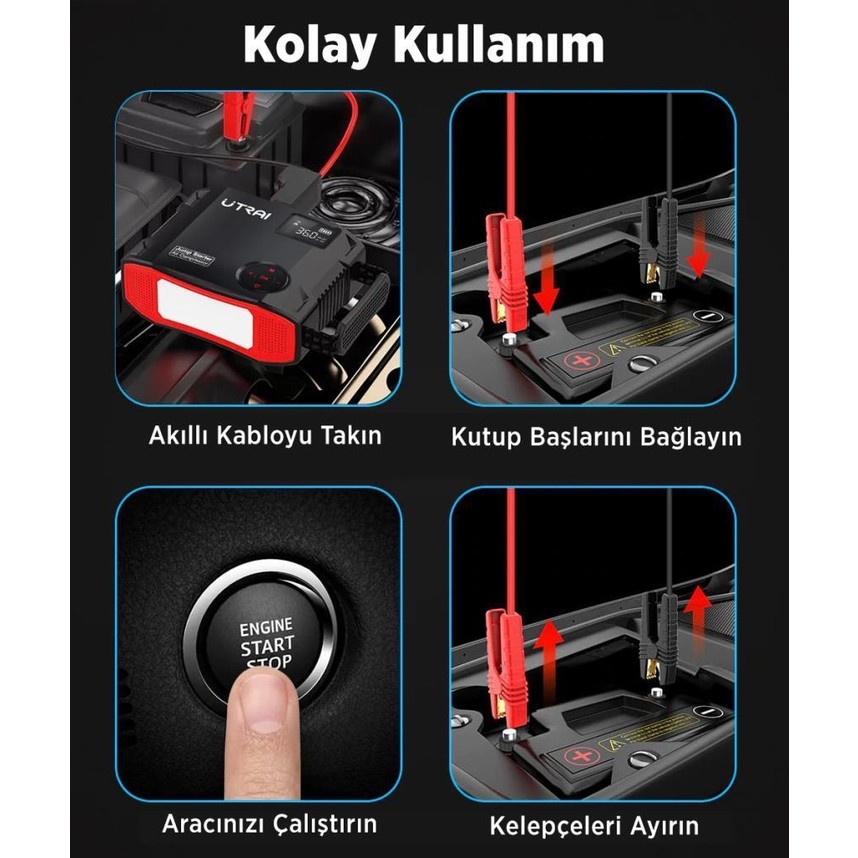 Ütraı Utraı Jstar 5 24000MAH 2000A Jump Starter Taşınabilir Akü Takviye Cihazı + Lastik Şişirme Hava Kompresörü ( Çanta + LCD Ekran + Powerbank + LED Lamba)