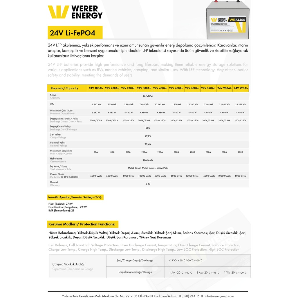 WERER ENERGY 24V 300Ah LiFePO4 Platinum Series Bluetooth’lu Lityum Demir Fosfat Akü